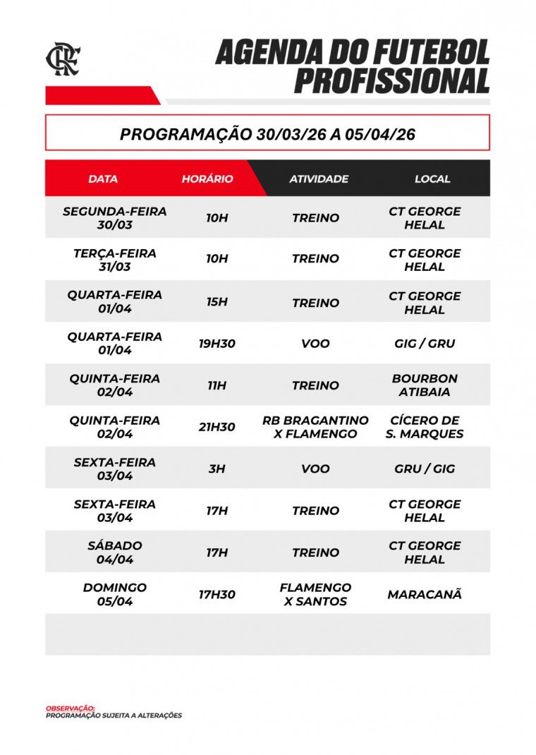 O Clube de Regatas do Flamengo abre o jogo com a sua imensa torcida e divulga oficialmente a programação do futebol profissional para a semana que vai do dia 30 de março ao dia 5 de abril. A agenda elaborada pela comissão técnica de Leonardo Jardim expõe uma rotina de preparação intensiva no Centro de Treinamento George Helal, o Ninho do Urubu, dividida entre logística de voos e dois compromissos fundamentais pelo Campeonato Brasileiro.