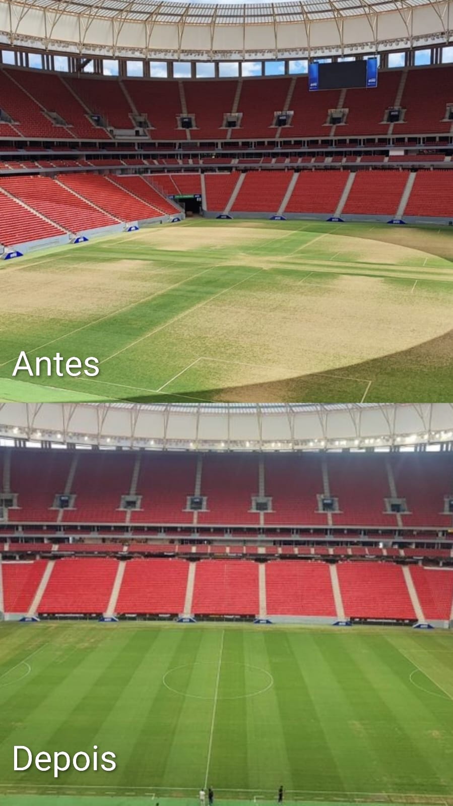 Já a foto mais recente, revelada nesta sexta-feira (30), mostra um gramado muito mais verde e denso. No entanto, apesar da evolução significativa, ainda é possível identificar algumas irregularidades visíveis na cobertura da grama, indicando que o campo pode apresentar variações em determinados setores.