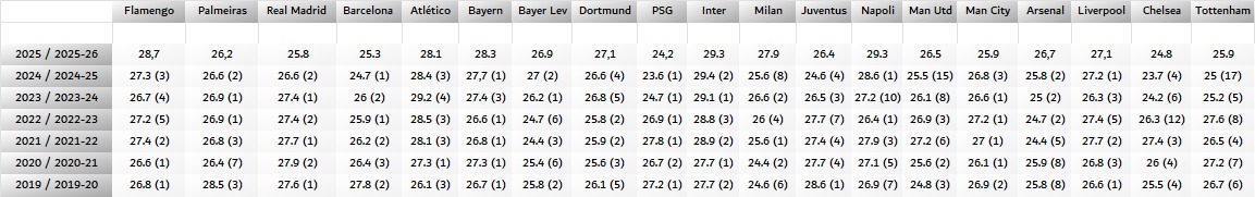 Ranking das menores e maiores médias de idade dos elencos na temporada atual entre clubes das cinco grandes ligas europeias (Big-5).