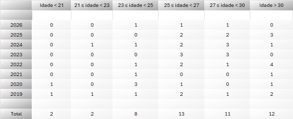 Além da média de idade atual, acho interessante entrar no tópico "política de contratações". Em 2024 eu escrevo AQUI uma análise mais aprofundada sobre isso, mas vou resumir os principais pontos e atualizar os dados nos próximos parágrafos.
