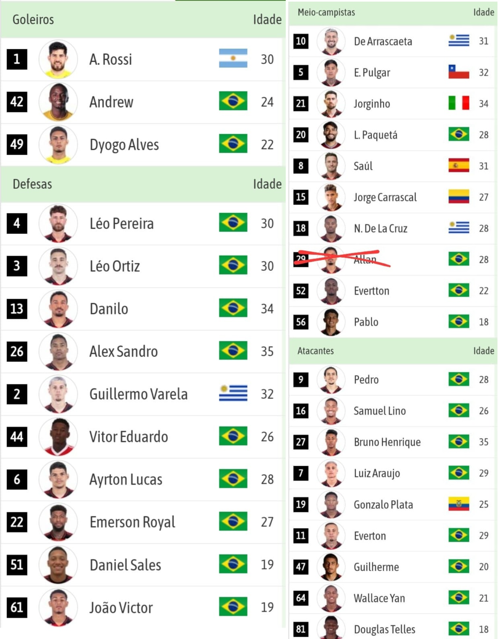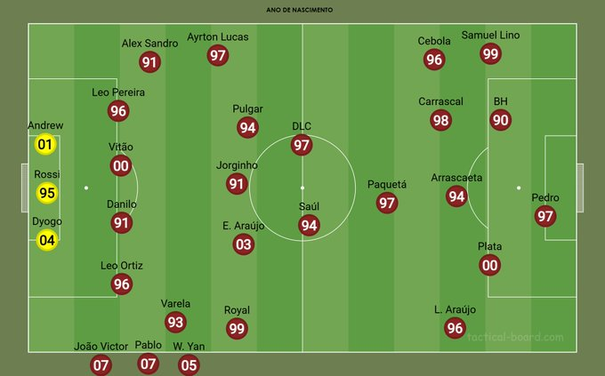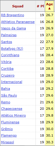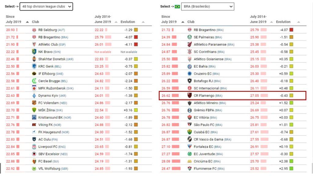 Naquele momento, entre os times da Série A, como já dito, o Red Bull Bragantino liderava, seguido por Palmeiras (24,39) e Athletico (24,84). O Flamengo aparecia em 10º, com média 26,62 anos. O último da lista era o Fluminense, com 28,47.