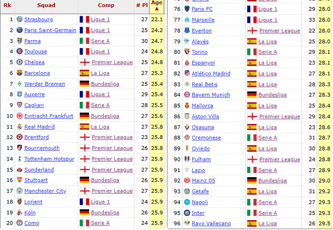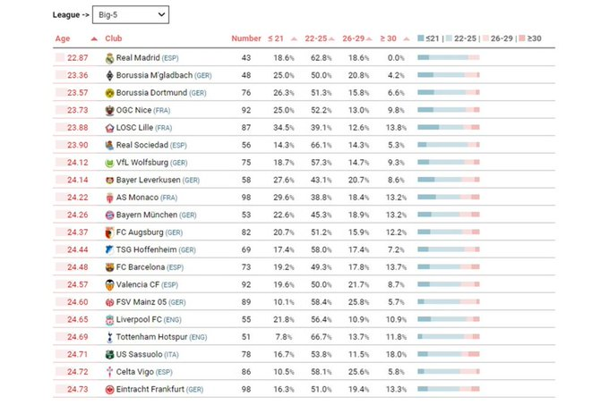 Em outubro de 2022, o CIES Football Observatory publicou um relatório sobre a média de idade das contratações dos 50 principais clubes das Ligas Big5 (Premier League, La Liga, Bundesliga, Serie A e Ligue 1) desde julho de 2013.
