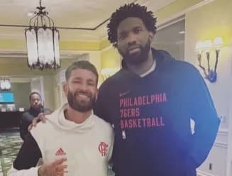 A primeira partida do Flamengo nos EUA, no domingo (21), é justamente contra o Philadelphia, mas o Union, da MLS. O zagueiro Léo Pereira fez questão de registrar o encontro com o craque e publicar nas suas redes sociais. Chama atenção que mesmo Léo, com 1,89m de altura, parece baixo ao lado da estrela da NBA. O jogador flamenguista escreveu: “Prazer em conhecê-lo, irmão”.