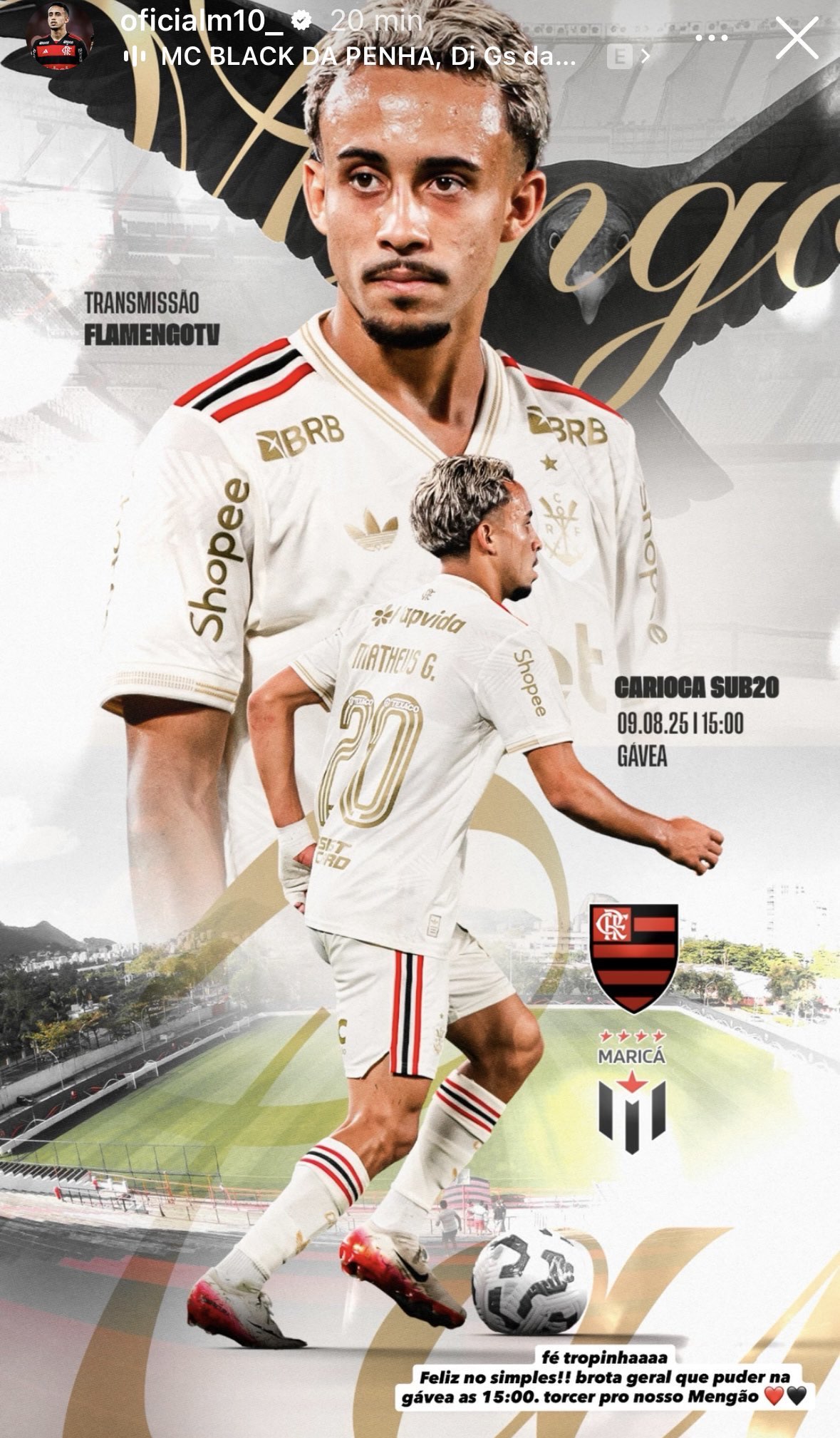 Matheus, que já teve oportunidades no time principal, foi relacionado pelo técnico Bruno Pivetti para o jogo da base e demonstrou tranquilidade com o momento. Em sua conta no Instagram, o jogador publicou uma foto com a mensagem: “Feliz no simples”, indicando que está mantendo uma postura positiva mesmo diante das mudanças recentes. O confronto da equipe sub-20 será transmitido pela FlamengoTV.