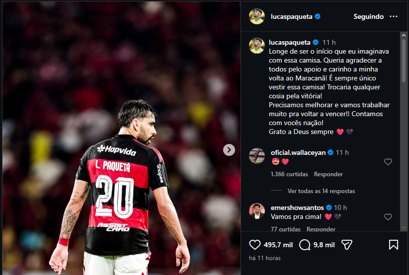 "Longe de ser o início que eu imaginava com essa camisa. Queria agradecer a todos pelo apoio e carinho na minha volta ao Maracanã! É sempre único vestir essa camisa! Trocaria qualquer coisa pela vitória! Precisamos melhorar e vamos trabalhar muito para voltar a vencer!! Contamos com vocês, Nação! Grato a Deus sempre", disse o jogador.