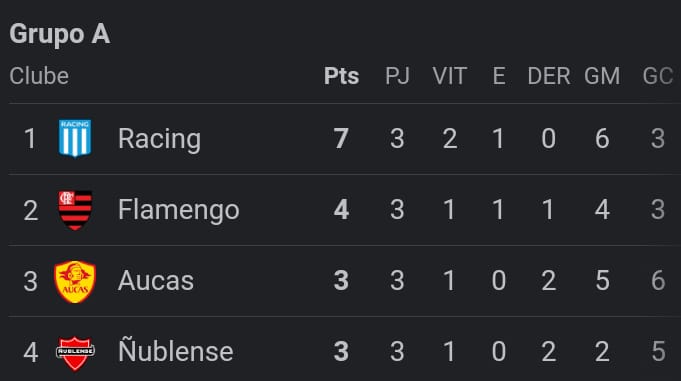Atual campeão, o Flamengo soma apenas quatro pontos de nove disputados. O grupo começa a ficar embolado, com Aucas e Ñublense empatados com três pontos cada. Mas o Rubro-Negro segue como favorito para avançar para as oitavas, já que ainda joga em casa duas vezes. Mas é preciso confirmar o favoritismo.