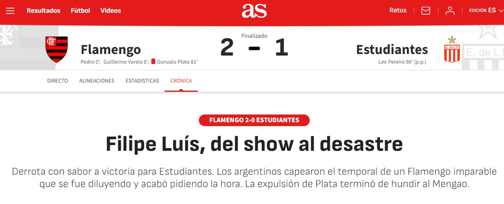 "Um polêmico vermelho para Plata mudou tudo. O time de Filipe Luís foi forçado a recuar e permitir uma série de bolas na área. A primeira chance clara foi defendida por Rossi, mas Carrillo foi implacável na segunda. O atacante do Pincha mereceu, e o que deveria ser uma comemoração no Maracanã se tornou um grito de guerra para os argentinos", disse.