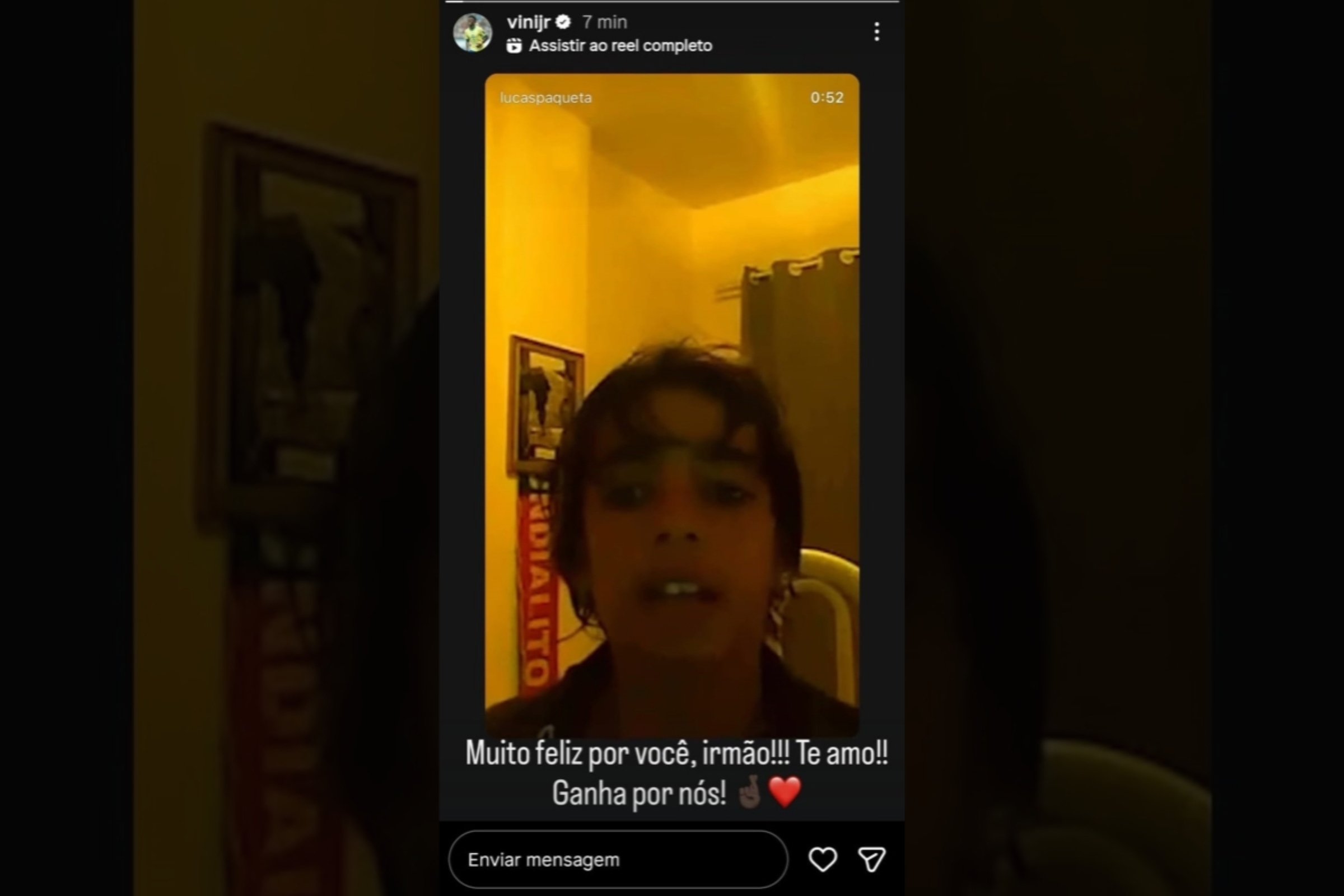 Cria do Ninho do Urubu assim como Paquetá, Vini repostou um vídeo divulgado pelo meia e deixou um recado direto. “Muito feliz por você, irmão! Te amo! Ganhe por nós”, escreveu o atacante em seu story no Instagram.