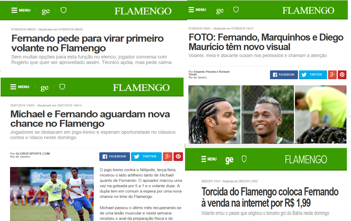 Egresso das divisões de base do Fluminense e irmão do meia Carlos Alberto, Fernando, após temporadas apagadas em São Paulo e Portuguesa, enfim encaixou uma boa passagem no Goiás, o que chamou a atenção do Flamengo, que precisava repor as ausências de Airton (negociado) e Maldonado (lesionado). Fernando logo se notabilizou pela desconcertante uniformidade em seu jogo, conseguindo revelar-se igualmente medíocre em todos os fundamentos da posição. Obtuso no apoio ao ataque (arrebentava todas as estatísticas de erros de passes) e exercendo uma marcação gentil na cabeça da intermediária (não seria surreal imaginar-lhe estendendo tapetes encarnados aos meias e atacantes adversários), não tardou a “cair nas graças” de uma torcida irritada com a tibieza da equipe que resultou do desmonte do time do Hexa Brasileiro. Sim, havia um ponto positivo. As bolas altas de ataque, que esporadicamente aproveitava com um ou outro golzinho. Entretanto, com as eliminações do Estadual e da Libertadores perdeu espaço e, após as contratações de Correa e Renato Abreu, fez do banco de reservas sua residência, anonimato de onde só saía quando surgia em reportagens no GloboEsporte, onde mostrava seu novo penteado ou esboçava lobbies pedindo oportunidades. Em 2011, “ressuscitou” com Luxemburgo, passando a entrar no final dos jogos. Em uma dessas ocasiões, errou um passe na entrada da área aos 48′ do segundo tempo de uma partida que o Flamengo vencia tranquilamente o Bahia em Pituaçu. A falha decretou o gol de empate dos baianos e o fim da esquecível trajetória de Fernando com a camisa do Flamengo. Enfurecida, a torcida o “pôs à venda” por R$ 1,99 em um desses sites de compra e venda. Pouco depois, foi negociado com o Grêmio Barueri e soterrado no lodaçal do anonimato.